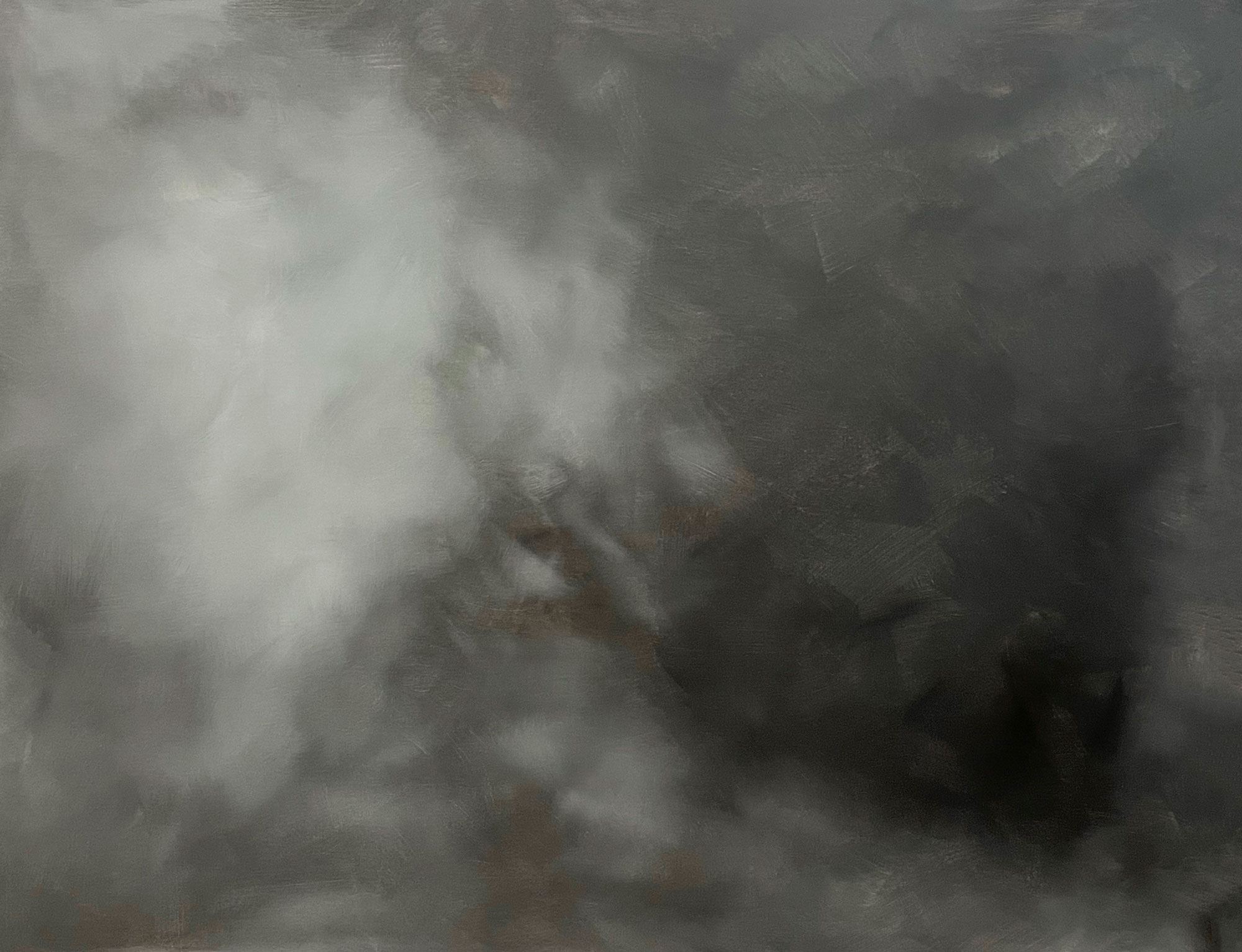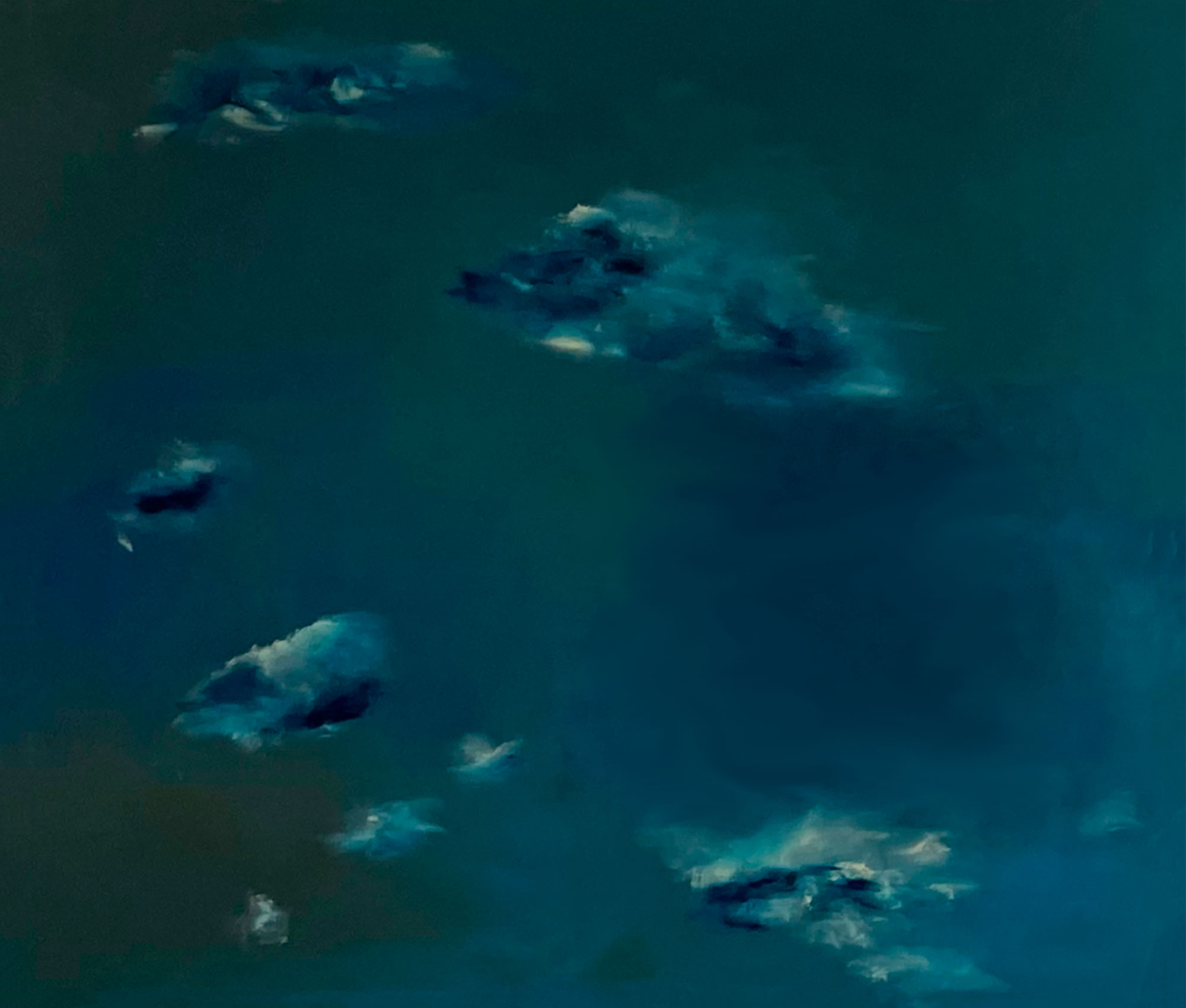 Ältere Arbeiten von ihr erinnern daran. Vergleichsweise milde geht es jetzt auf der Leinwand zu; das neue Thema, das alles beherrschende, totale Thema, sind nun die Wolken und nur die Wolken am Himmel. Nichts Strahlendes, Schönes, Weißes, Heiteres malt sie, die Sonne spielt keine Rolle, nur die Farben Blau und Grau vornehmlich in allen Nuancen.