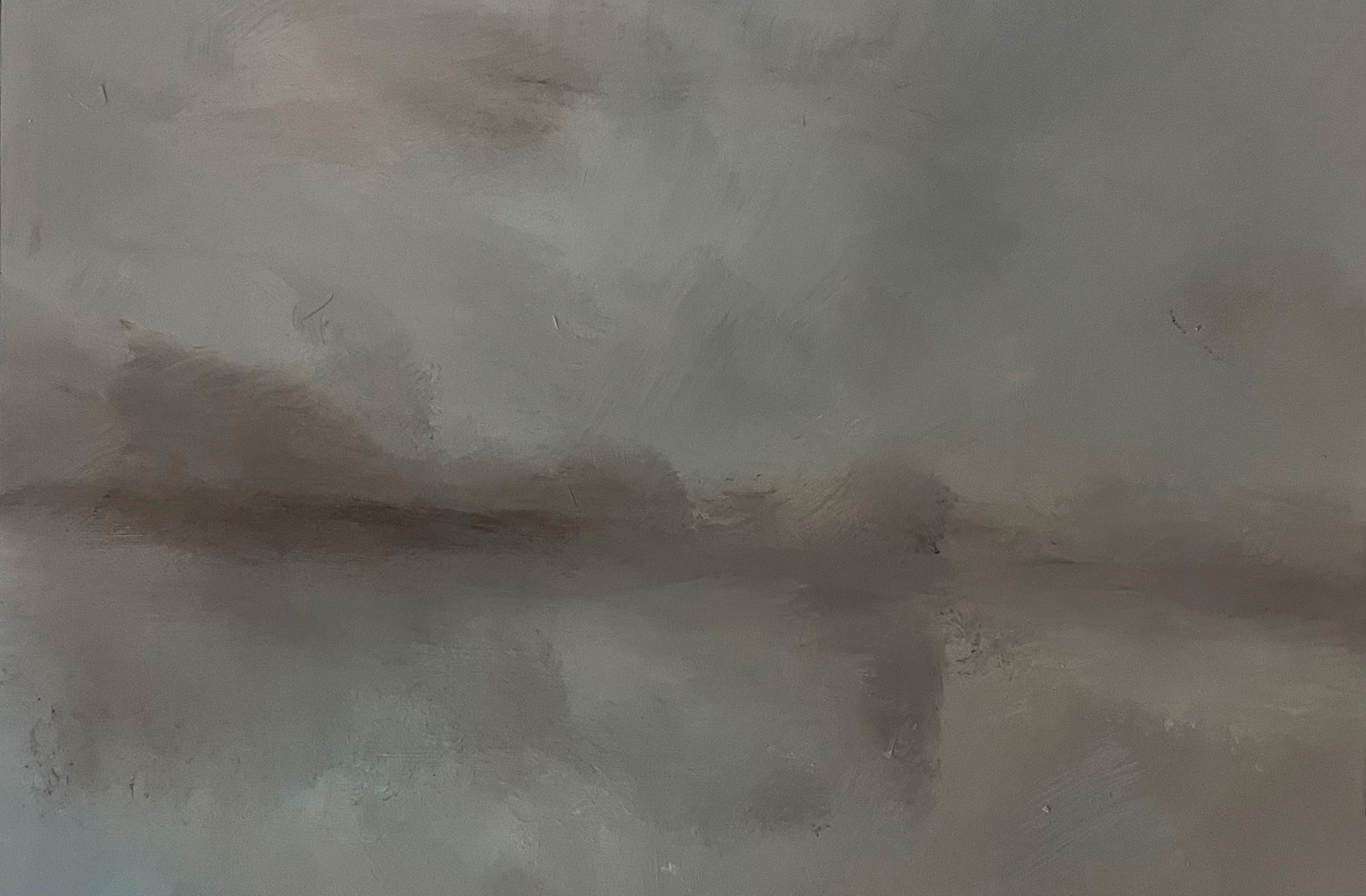 Ich kenne Elkes vorigen Neuen Bilder, von Fotos, und ich mag sie sehr: Orgien von Pinselstrichen, in einem Zug über die ganze Leinwand geratscht, blaues Blau, blutiges Rot, heftige Einsprengsel von Schwarz, Grün, Gelb. Und nun? Nein, kein Pinselstrich darf zu sehen sein! sagt Elke, das gehört zum Konzept. Davon später. Aber von Wolken dürfen wir reden, vorläufig. Schließlich tragen die Bilder Titel wie Cumulus im November I, Cumulus im November II oder schlicht Wolken.