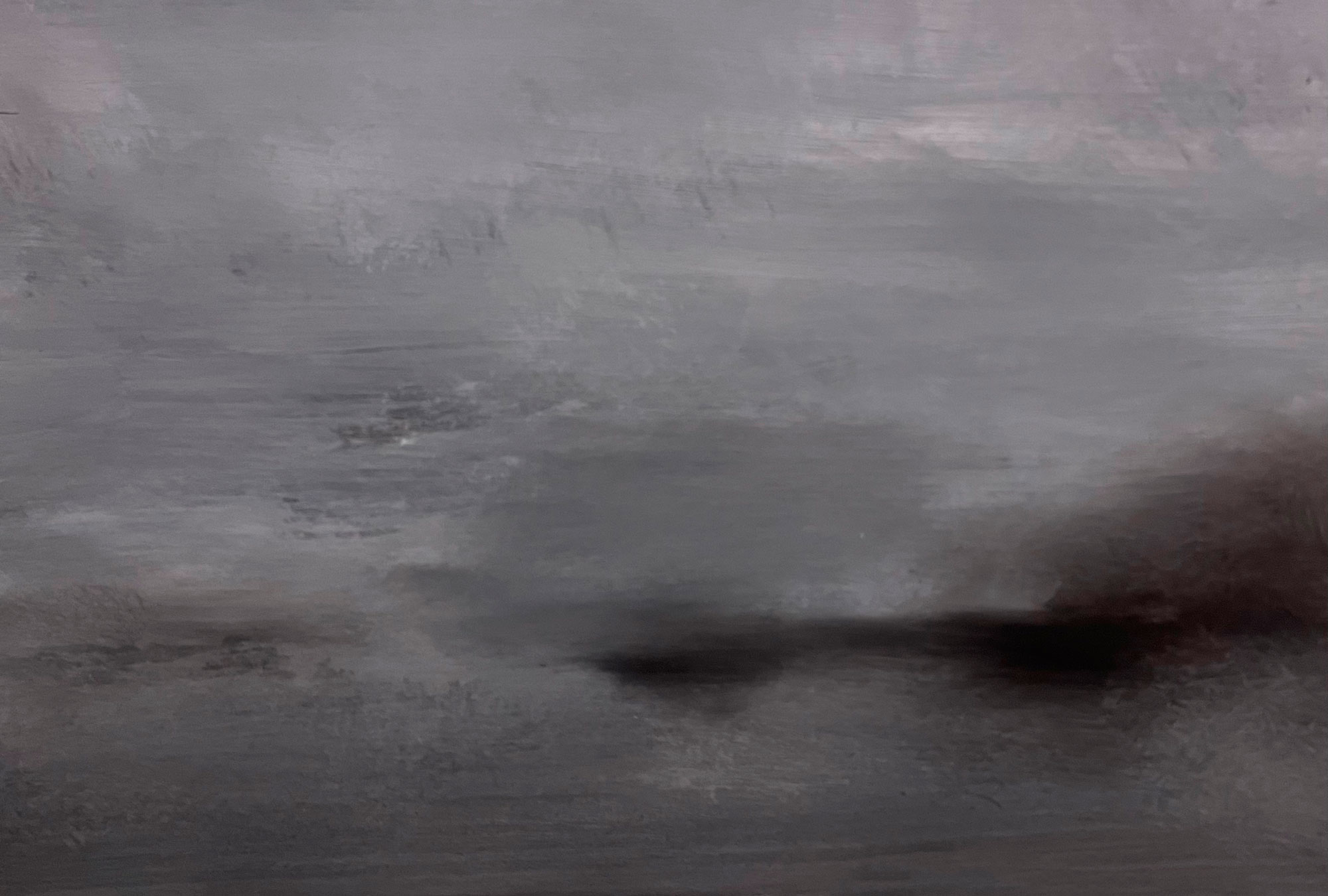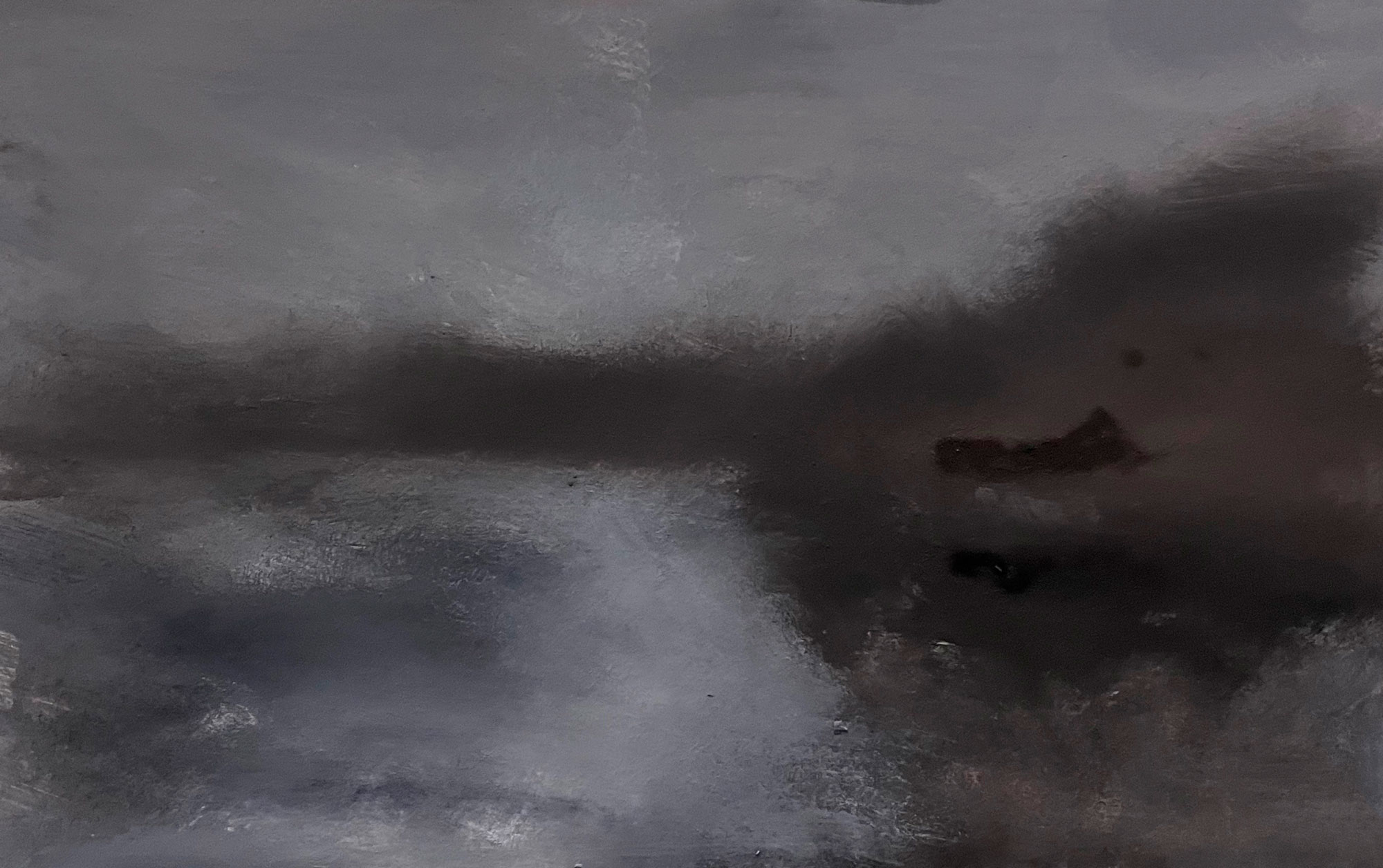 Was ist das Geheimnis, frage ich Elke, oder nennst du es lieber Konzept? Ganz einfach, sagt sie, farbig grundierte Leinwand (welche Farbe?), hast du das nicht gemerkt, Ölfarben, nicht Acryl, reduzierte Palette, Schwarz, Weiß, Blau, Mischung teils vorab, teils beim Malen auf der Leinwand. Mit der schwarzen Keimzelle fange ich an, von da an entwickelt es sich, Skizzen mache ich keine, Fluchtpunkt gibts nicht. Wenn es sich falsch entwickelt, wenn nur ein Fleckchen nicht stimmt, muss ich eingreifen, alles komplett neu anlegen, sonst sind die Übergänge nicht weich. Je öfter das passiert, desto mehr Schichten habe ich, und damit krieg ich die Tiefe, die Weichheit und die Ungegenständlichkeit. Informel in Wolkenform. Genau, sage ich, danach habe ich gesucht.